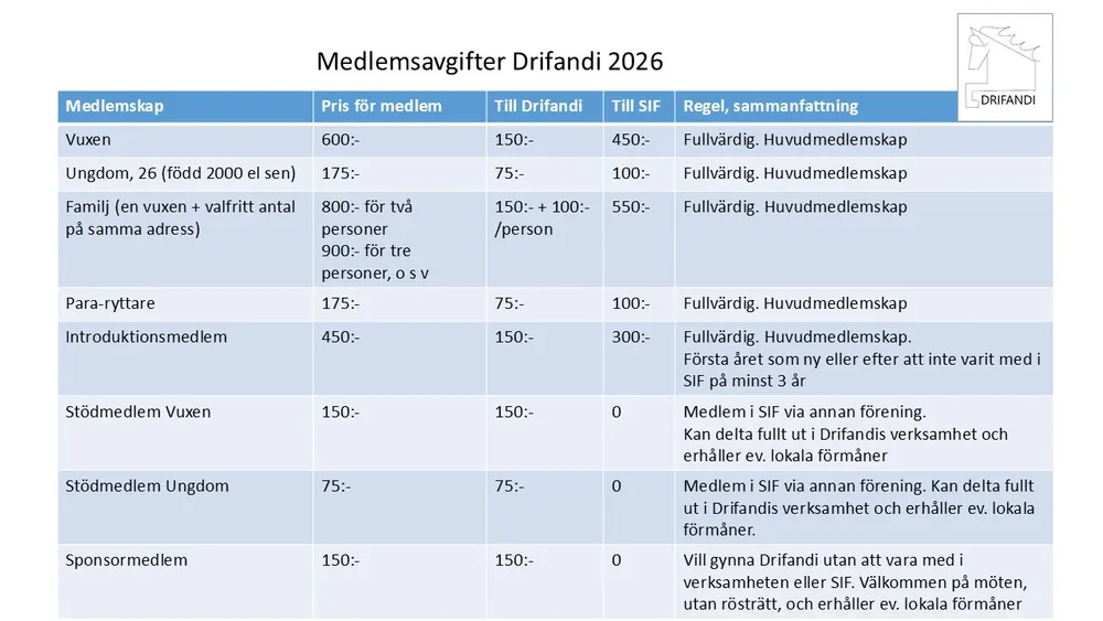 Alla som gillar islandshästar är välkomna som medlem i Drifandi, se tabellen nedan för alternativen som finns.